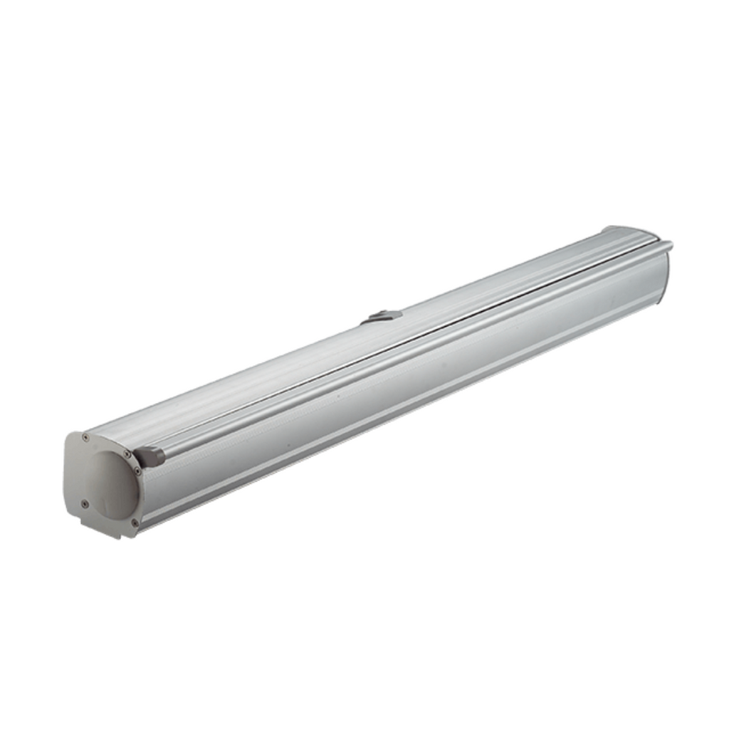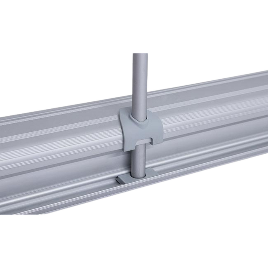 Package Includes: Aluminium frame with plastic end caps, 600D PU coated polyester pull up fabric and single sided custom printing